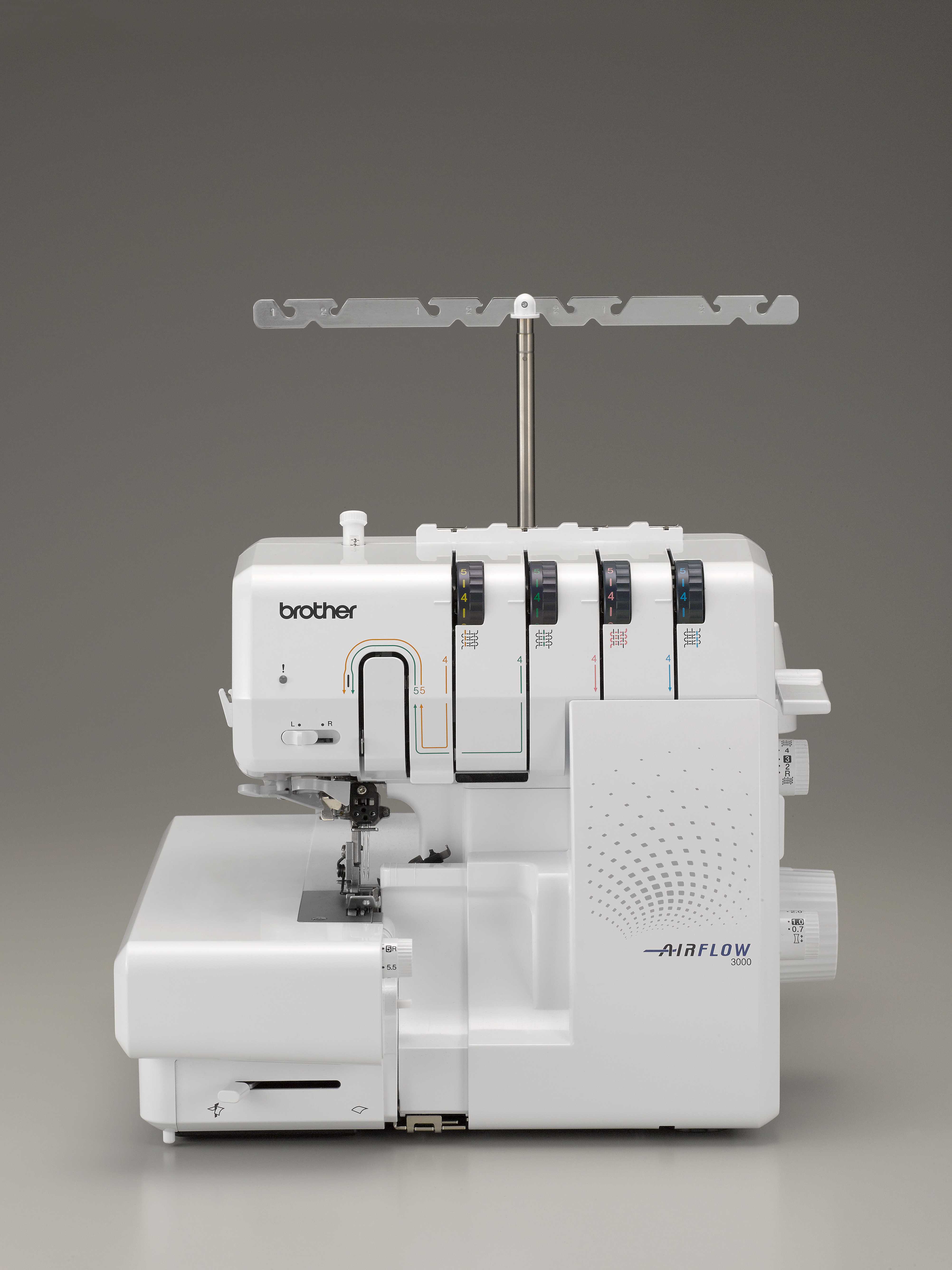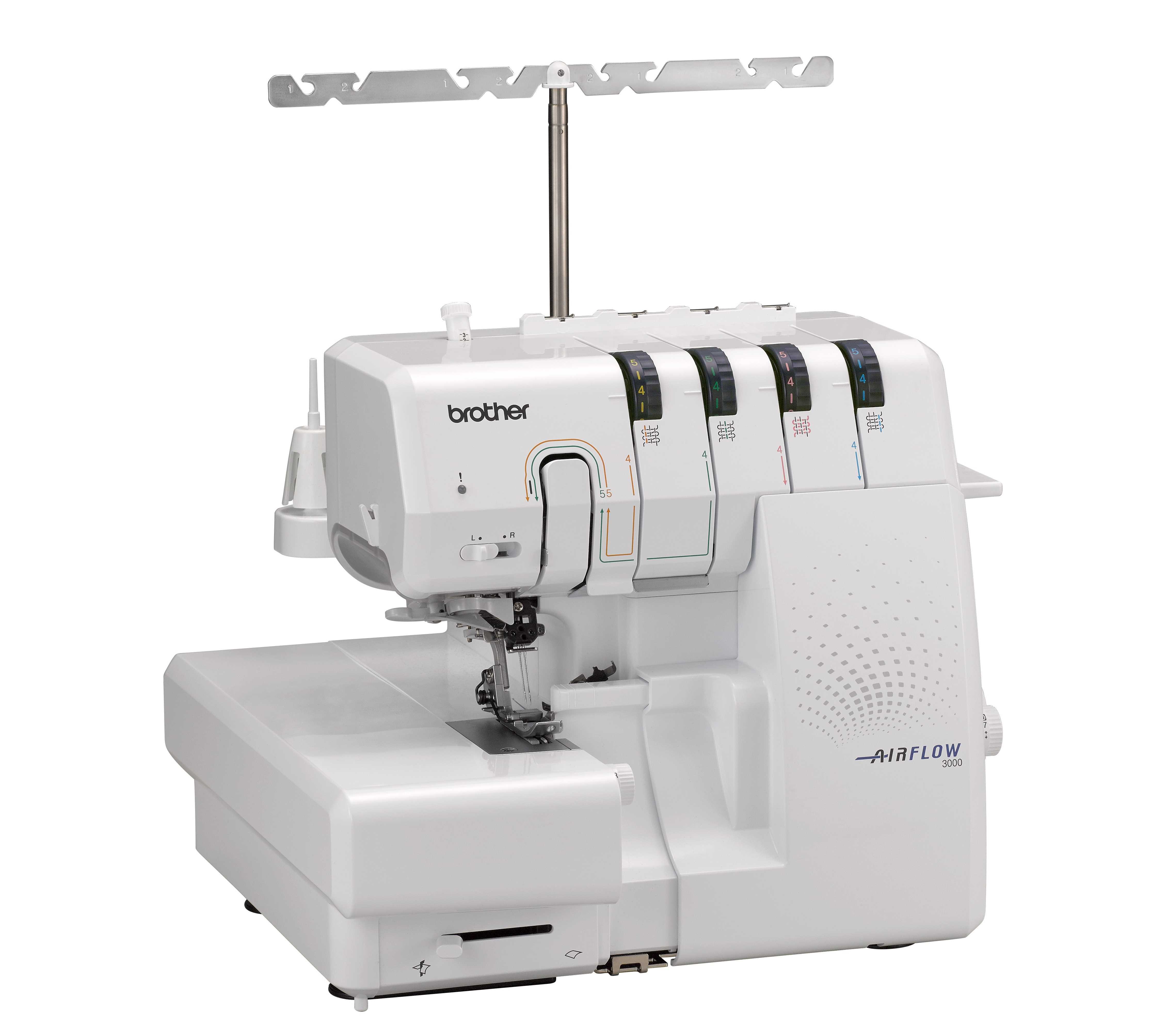 Excellent for challenging fabrics such as fine knits and stretchy materials, the AIRFLOW 3000 Air Serger can achieve outstanding finishing touches with flatlock, overlock, and rolled hem stitches on most specialty fabrics. The modernistic AIRFLOW 3000 can cut and finish seams all in one pass. It's a breath of fresh air to change threads as the AIRFLOW 3000 threading ports are connected to the end of each looper by tubes, and at the touch of a button, a blast of air sends the threads through the loopers, so it's a cinch to change thread colors.
