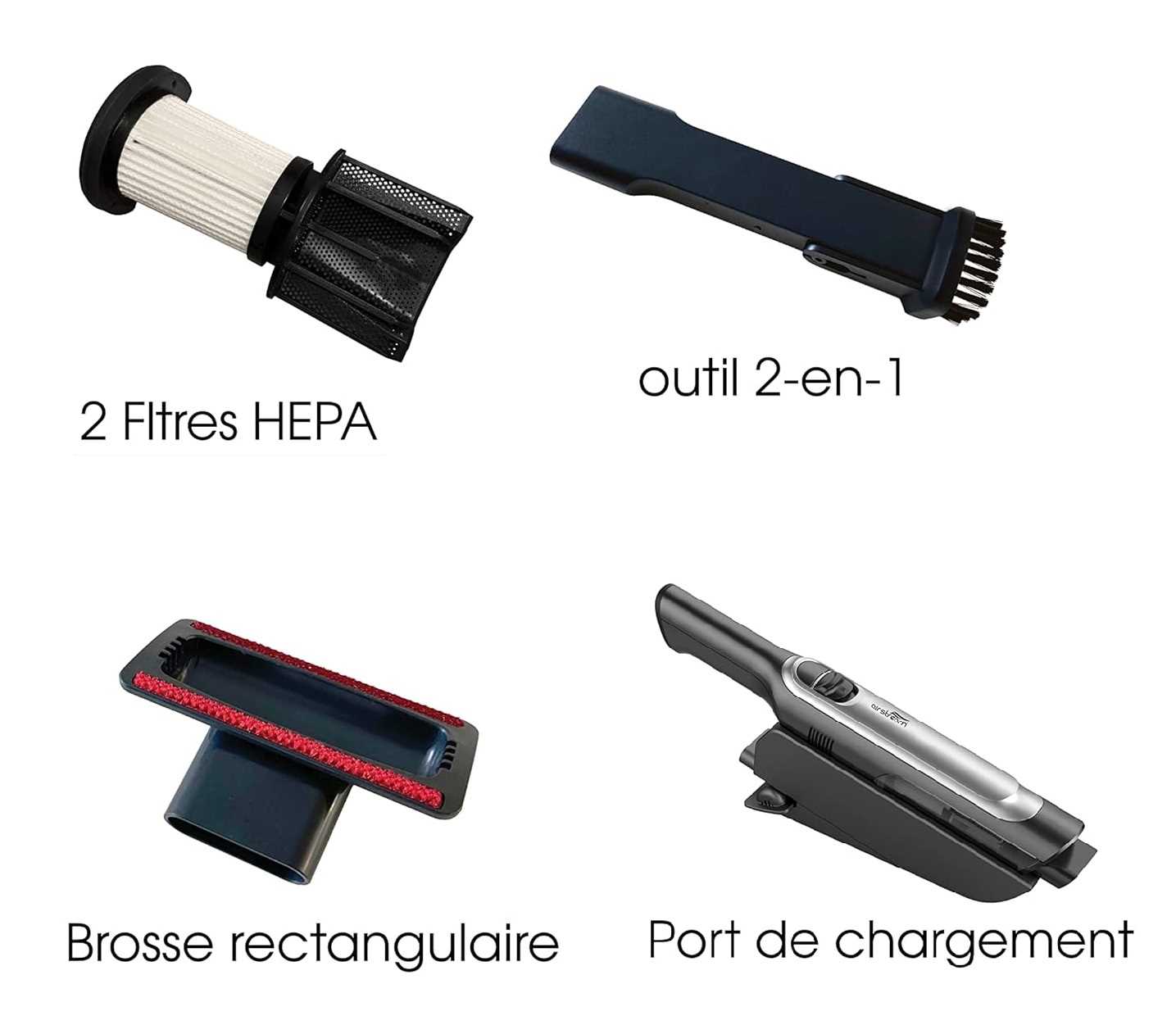 Ses deux accessoires vous permettent de ramasser les gros débris, les poussières fines, les poils d'animaux ou encore de nettoyer les tissus d'ameublement et les espaces étroits. C'est l'outil idéal pour les dégâts quotidiens. Enfin, il n'est pas nécessaire de sortir votre aspirateur pleine grandeur pour nettoyer un peu de désordre.