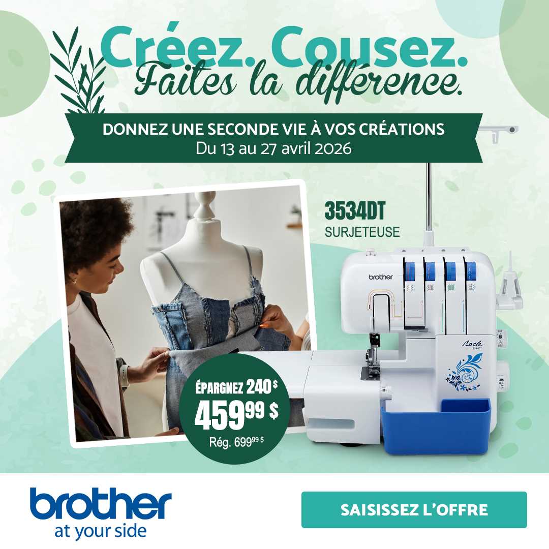 La 3534DT est rapide, facile à utiliser, facile à enfiler et son bras libre permet de coudre des manches, des jambes de pantalon et d'autres endroits difficiles d'accès. Avec la grande table incluse, cette surjeteuse est l'outil parfait pour vos projets de plus grande envergure. Dotée d'un espace de travail à DEL bien éclairé, vous pouvez voir même les plus petits détails lorsque vous travaillez sur vos projets. Offrant une configuration à trois et quatre fils, cet outil utilise un rapport d'entraînement différentiel de 0,7 à 2,0 pour une meilleure qualité de point sur une grande variété de tissus.