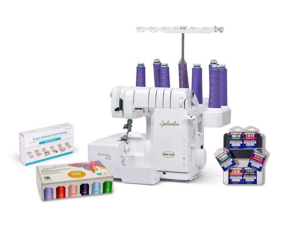 Pour une durée limitée, achetez Splendor et recevez gratuitement un ensemble d'accessoires comprenant un kit de pied pour surjeteuse, un assortiment de fils Madeira et une boîte d'aiguilles Klassé.