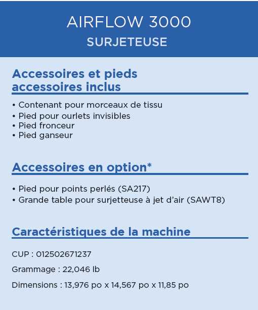 Excellent for challenging fabrics such as fine knits and stretchy materials, the AIRFLOW 3000 Air Serger can achieve outstanding finishing touches with flatlock, overlock, and rolled hem stitches on most specialty fabrics. The modernistic AIRFLOW 3000 can cut and finish seams all in one pass. It's a breath of fresh air to change threads as the AIRFLOW 3000 threading ports are connected to the end of each looper by tubes, and at the touch of a button, a blast of air sends the threads through the loopers, so it's a cinch to change thread colors.