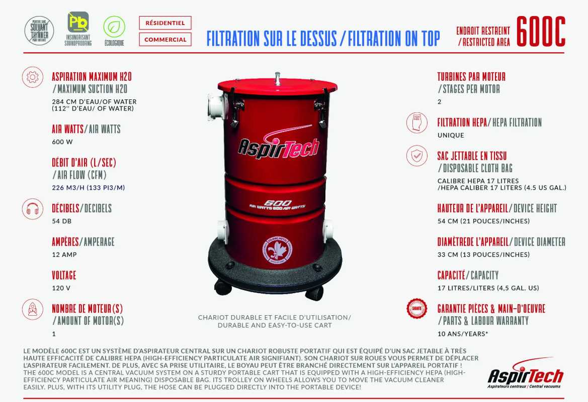 Le modèle 600 est un système d’aspirateur central, avec un sac jetable de qualité Hepa .Son sac se change par le dessus de l'appareil. Sa forme compacte et légère facilite l’installation dans les endroits les plus restreints. Idéal pour les condos, les motorisés, les roulottes, les chalets. Son prix très compétitif est une de ses caractéristiques des plus intéressantes.