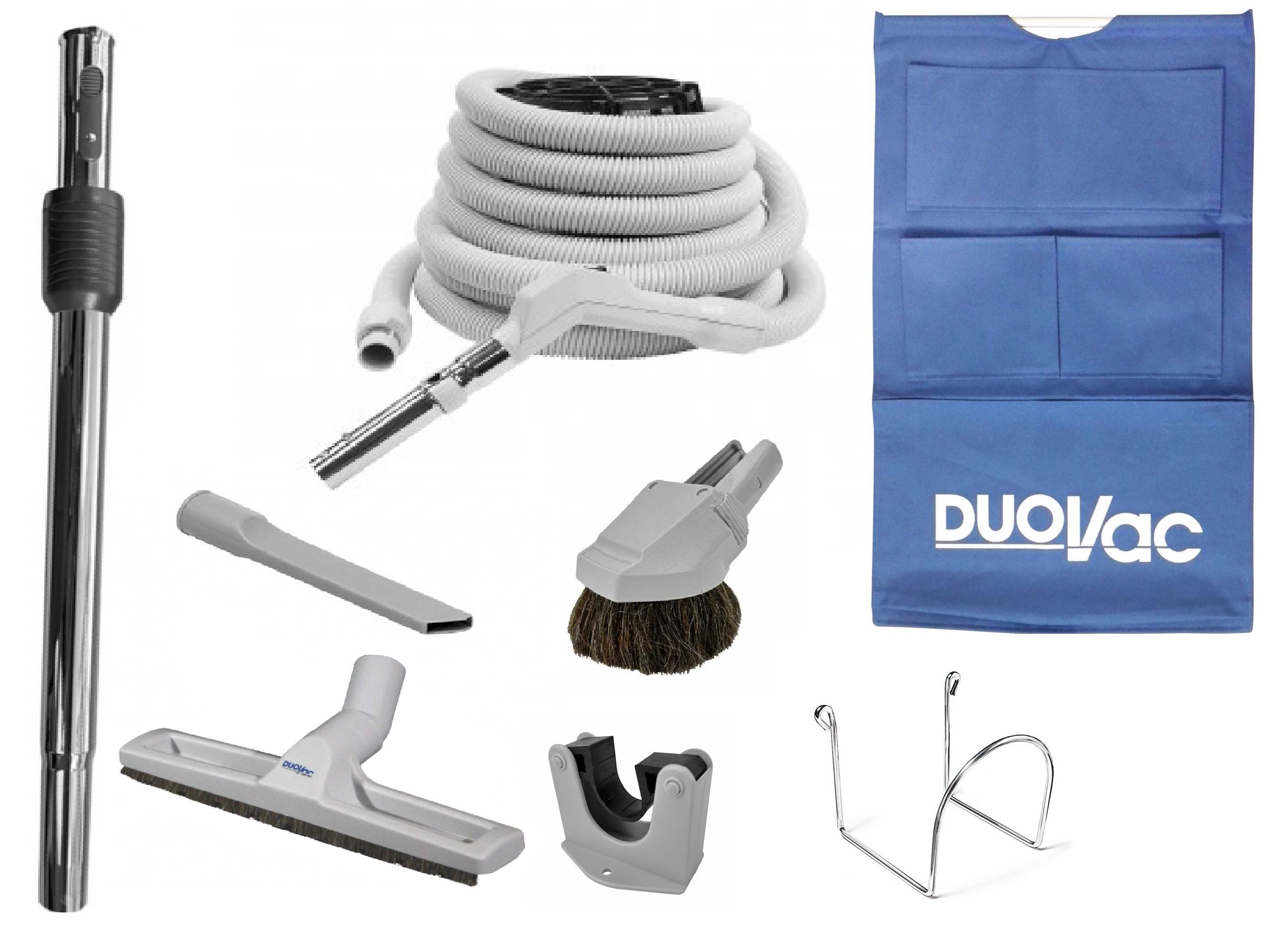 Ensemble de boyau 30 pieds de luxes garantie de 3 ans. Incluant brosse à plancher à roue, manchon télescopique, outil a coin, brosse à épousseter deluxe combiné pour brosse à divan. Aussi support murale pour manchon et boyau. Sac bleu à outil .
